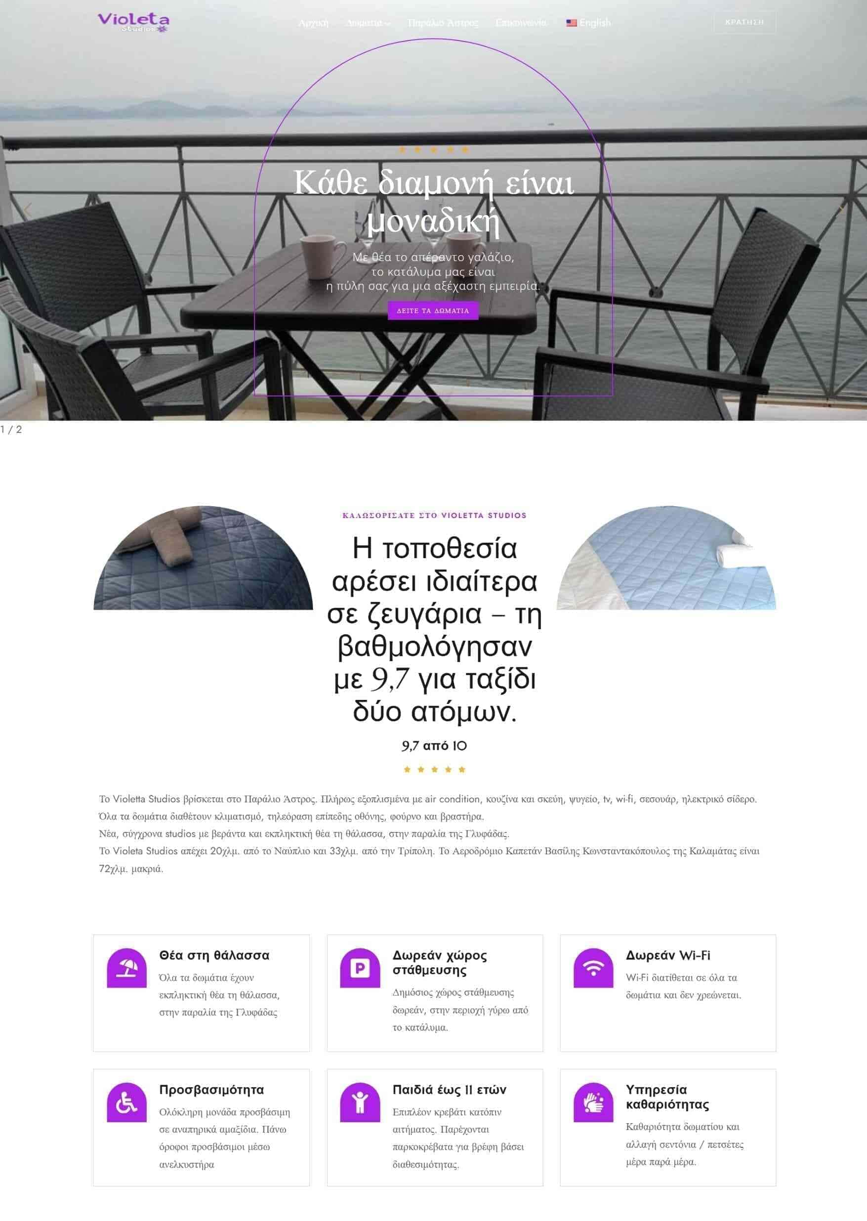 Το Violetta Studios είναι ένα συγκρότημα διαμερισμάτων που βρίσκεται στη Γλυφάδα του Παραλίου Άστρους, με εξαιρετική τοποθεσία δίπλα στη θάλασσα και υψηλή βαθμολογία στις πλατφόρμες κρατήσεων.